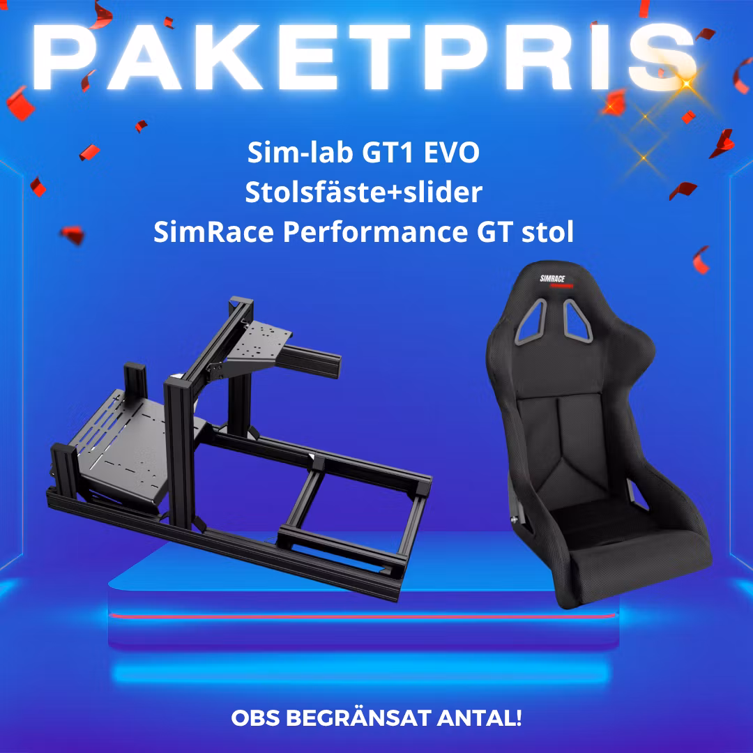Detta paket kombinerar den välbeprövade Sim-Lab GT1 EVO-riggen med stolsfäste, slider och SimRace Performance GT-stolen. Tillsammans utgör det en stabil och ergonomisk plattform för simracing på hög nivå, oavsett om du är entusiast eller tävlingsförare.