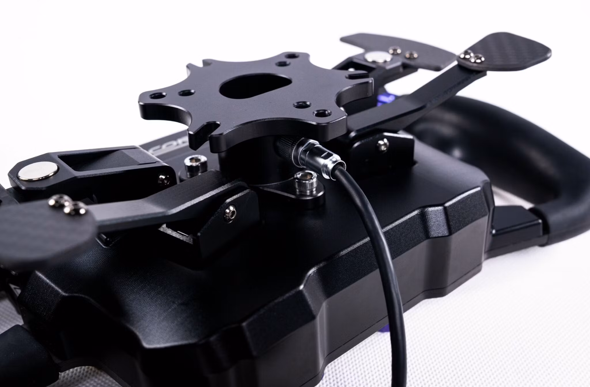 The front panel is constructed from 5mm thick real carbon fiber, combined with a one-piece aluminum alloy body. Optimized stress points and cutouts ensure maximum rigidity, even with high-torque DD wheels. Rotary knobs, thumb encoders, and button surrounds are crafted from metal for a premium, solid feel.